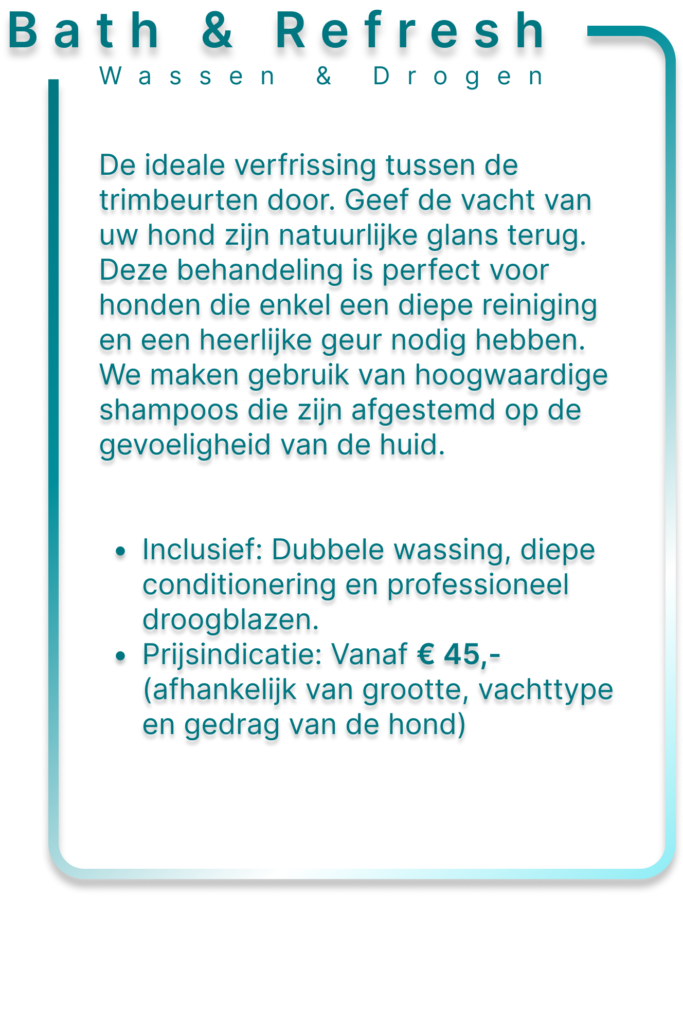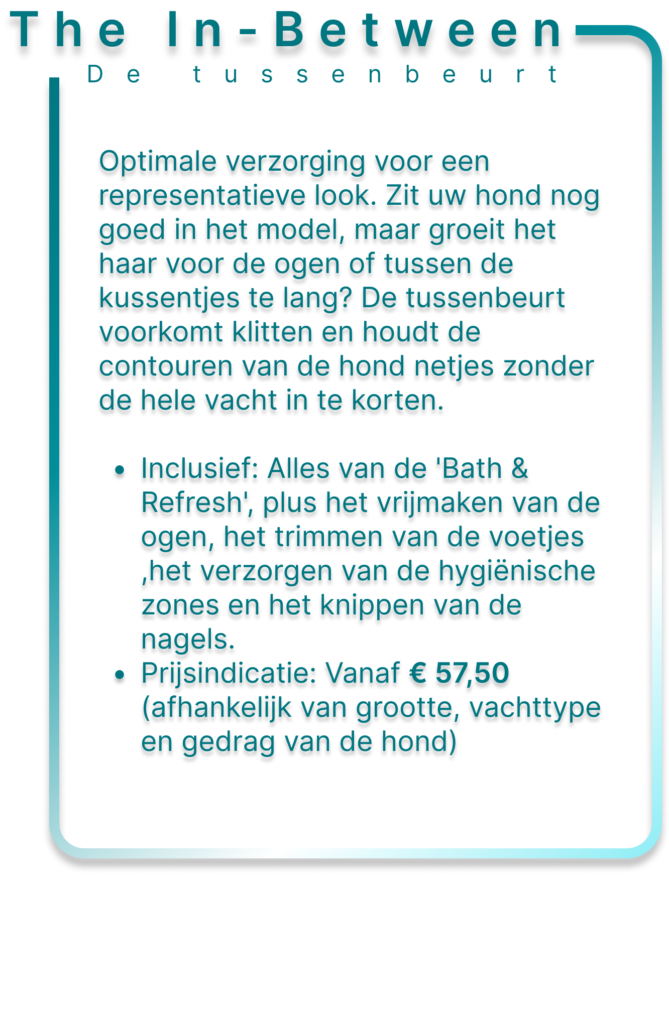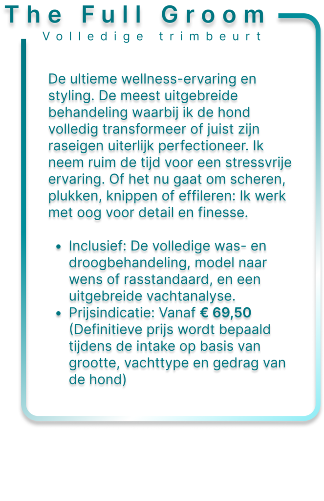“Bij hondentrimsalon The Barking Beauty draait alles om één ding: een blije hond in een prachtige vacht. Ik ben Kimberley, een gediplomeerd trimster die met veel geduld en liefde alle soorten vachten verzorgt. Omdat ik alleen werk, krijgt jouw hond mijn onverdeelde aandacht in een prikkelarme omgeving.